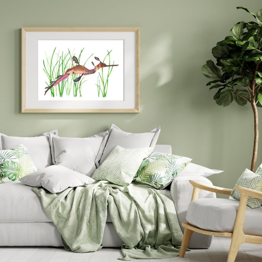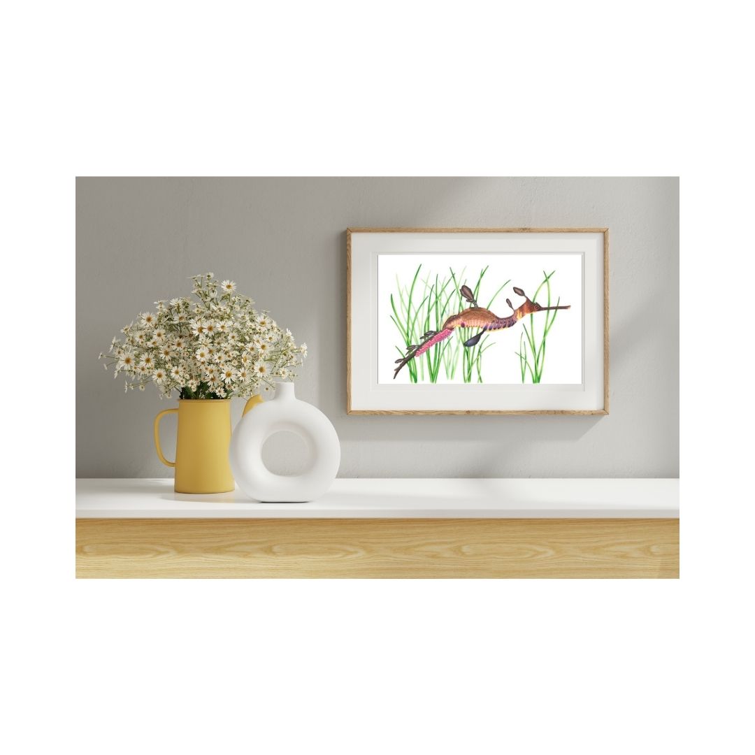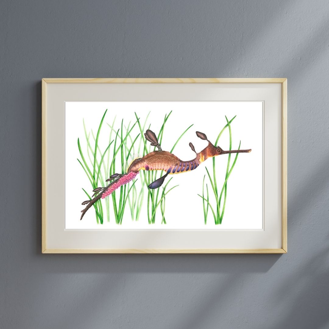 The Weedy Seadragon is one of Australia’s most enchanting marine creatures, with delicate, leaf-like appendages and slow, graceful movements that make it look like a drifting piece of seaweed. Found only in the coastal waters of southern Australia, it holds special significance as the marine emblem of Victoria. As shown in this drawing, it is the male who carries the eggs on his tail, protecting them until they hatch. Remarkable and elusive, weedy seadragons are a quiet reminder of the magic that lies beneath our seas.